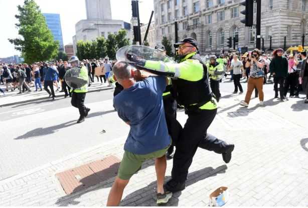 وقالت شرطة ميرسيسايد إن ضابطين نُقلا إلى المستشفى، حيث يعاني أحدهما من كسر في الأنف، بينما يُعتقد أن الآخر يعاني من كسر في الفك وقالت القوة إن عددًا من الضباط أصيبوا خلال "اضطرابات خطيرة" في وسط مدينة ليفربول، حيث تعرض أحد الضباط للضرب على رأسه بكرسي، وركل أحد المتظاهرين ضابطًا آخر وأسقطه عن دراجته النارية.