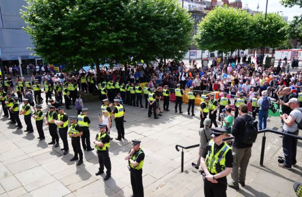 واندلعت اشتباكات عندما واجهت مجموعات متعارضة بعضها البعض في ساحة السوق في نوتنغهام حيث تم إلقاء الزجاجات وغيرها من الأشياء من الجانبين، وغطت هتافات "إنجلترا حتى أموت" و"تومي روبنسون" على صيحات الاستهجان من المتظاهرين المضادين واقتيد ثلاثة أشخاص على الأقل مكبلين بالأصفاد في مدينة إيست ميدلاندز.
