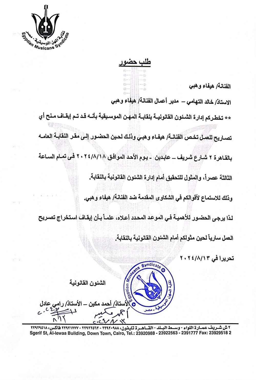 واستكمل البيان: وذلك للاستماع لأقوالكم في الشكاوى المقدمة ضد الفنانة هيفاء وهبي لذلك يرجى الحضور للأهمية في الموعد المحدد أعلاه، علما بأن إيقاف استخراج تصريح العمل ساريا لحين مثولكم امام الشئون القانونية للنقابة.