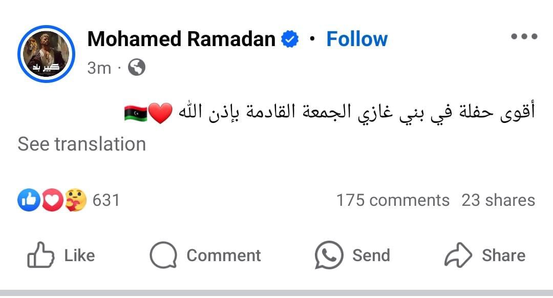 بينما أعلن رمضان عبر صفحته الرسمية على موقع التواصل الاجتماعي فيس بوك، عن هذا الحفل، وكتب رمضان: "أقوى حفلة في بنغازي الجمعة القادمة بإذن الله".