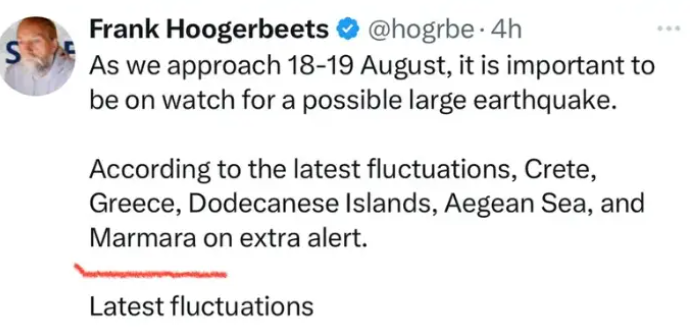ومنذ أيام، أكد عالم الزلازل الهولندي فرانك هوجربيتس، أن هناك توقعات بحدوث هزات أرضية جديدة خلال شهر أغسطس الجاري، واصفًا الشهر بأنه "شهر الحسم"؛ بسبب تقارب بعض الكواكب الحرجة.