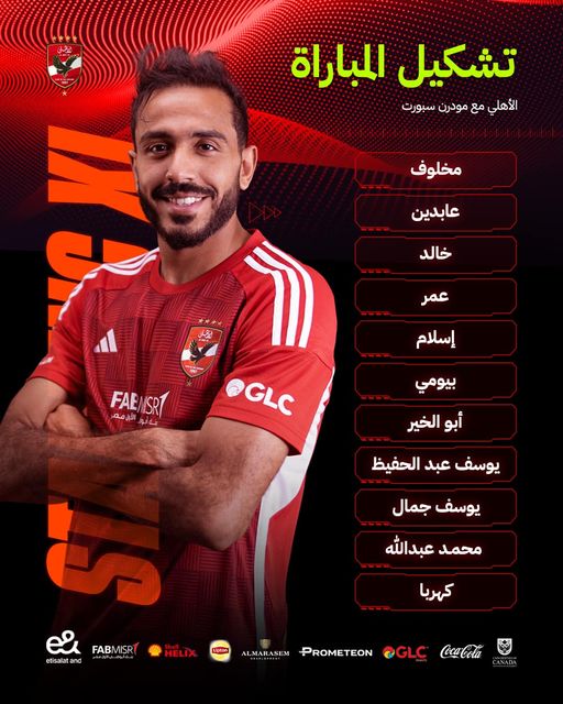أعلن سامي قمصان، مدرب الفريق الأول لكرة القدم بالنادي الأهلي، تشكيل الفريق لمباراة مودرن سبورت التي تنطلق في التاسعة مساء على استاد القاهرة ضمن منافسات الجولة الـ34 لبطولة الدوري الممتاز.