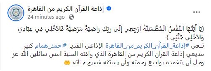 نعت إذاعة القرآن الكريم الإعلامي أحمد همام عبر الصفحة الرسمية على Facebook وكتب: "{يَا أَيَّتُهَا النَّفْسُ الْمُطْمَئِنَّةُ ارْجِعِي إِلَى رَبِّكِ رَاضِيَةً مَرْضِيَّةً فَادْخُلِي فِي عِبَادِي وَادْخُلِي جَنَّتِي }