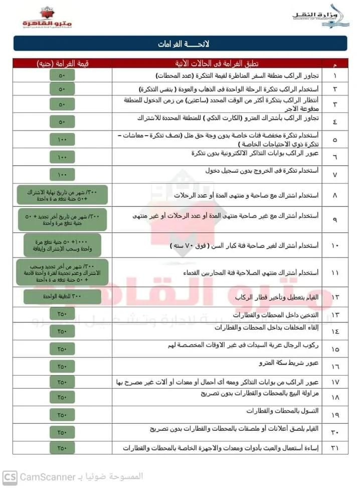 أعلنت الشركة المصرية لإدارة وتشغيل مترو الأنفاق، عن لائحة الغرامات بالشركة والتي نشرت باللغتين العربية والإنجليزية لتعريف الركاب بالتعليمات عند استخدامهم خطوط المترو.