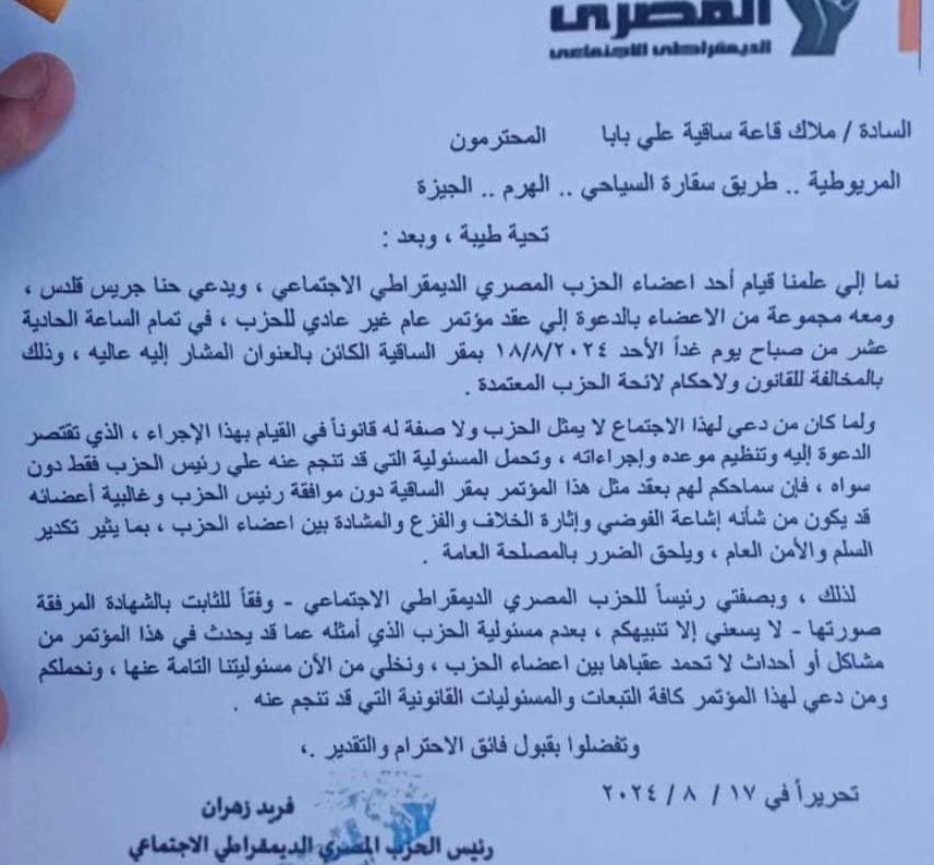 وكان فريد زهران، رئيس الحزب، حذر إحدى القاعات في الجيزة من السماح لأعضاء الحزب المعارضين له بالاجتماع داخل جدرانها، واصفا إياهم بـ"أنهم لا يمثلون الحزب وليسوا أعضاء فيه".