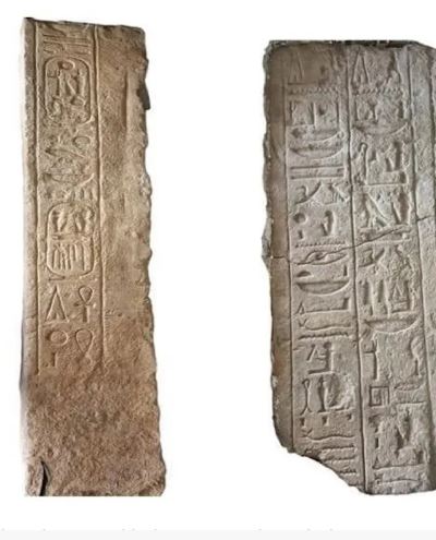 وعثر أيضًا على كتلتين من الحجر الجيري منقوشتين؛ إحداهما تحمل نقشًا هيروغليفيًا يذكر رمسيس الثاني، بينما تذكر الأخرى مسؤولًا يُدعى "باي".