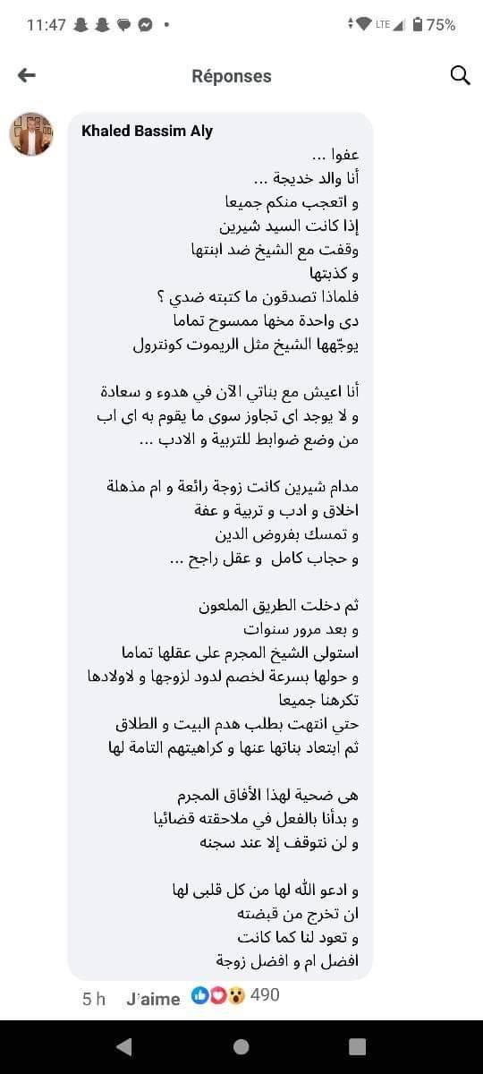 وقال خالد باسم والد خديجة: “أنا والد خديجة، والسيدة شيرين ـ ”يقصد طليقته" ـ واحدة مخها ممسوح تماما من الشيخ مثل الريموت كنترول"