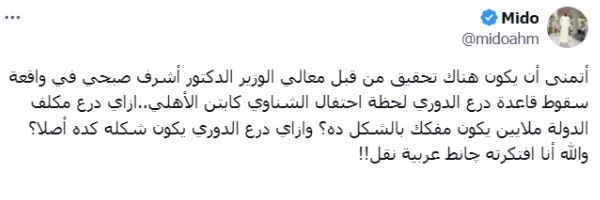 وقال أحمد حسام "ميدو" في تغريدة على حسابه، عبر منصة "أكس"، تويتر سابقًا، عن واقعة سقوط قاعدة درع الدوري: "أتمنى أن يكون هناك تحقيق من قبل معالي الوزير الدكتور أشرف صبحي في واقعة سقوط قاعدة درع الدوري لحظة احتفال الشناوي كابتن الأهلي..".