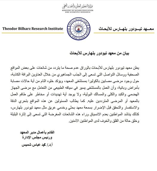 كشف معهد تيودور بلهارس للأبحاث حقيقة ما يتردد حول وجود مرضى مصابين بالكوليرا بمستشفى المعهد، نافيا صحة تلك المعلومات، مؤكدا خلوه التام من أية حالات مصابة بأمراض وبائية.
