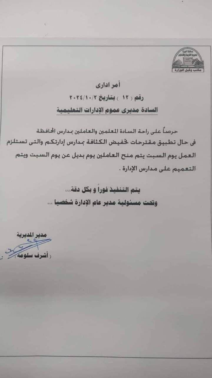 قالت المديرية في خطاب لها تم تعميمه علي جميع الإدارات التعليمية: حرصا علي راحة المعلمين والعاملين بمدارس المحافظة في حال تطبيق مقترحات تخفيض الكثافة بمدارس إدارتكم والتي تستلزم العمل يوم السبت يتم منح العاملين يوم بديل عن يوم السبت ويتم التعميم علي مدارس الإدارة.