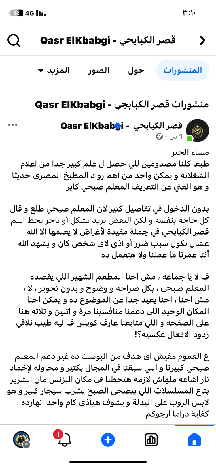 وأضاف المنشور: “بدون الدخول في تفاصيل كتير لأن المعلم صبحي طلع، وقال كل حاجة بنفسه ولكن البعض يريد بشكل أو بآخر يحط اسم قصر الكبابجي في جملة مفيدة لأغراض لا يعلمها إلا الله عشان نكون سبب ضرر أو أذى لأي شخص كان، ويشهد الله أننا عمرنا ما عملنا ولا هنعمل ده.. لا يا جماعة، مش احنا المطعم الشهير اللي يقصده المعلم صبحي، بكل صراحة ووضوح وبدون تحوير، لا مش احنا، احنا بعيد جدا عن الموضوع ده ويمكن إحنا المكان الوحيد اللي دعمنا منافسينا مرة واتنين وتلاتة هنا على الصفحة، واللي متابعنا عارف كويس فـ ليه طيب نلاقي ردود الأفعال عكسية؟!”.