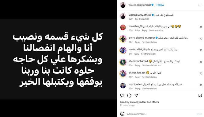 كتب وليد سامي: «كل شيء قسمة ونصيب أنا وإلهام انفصلنا، واشكرها على كل حاجة حلوة كانت بيننا، وربنا يوفقها ويكتبلها الخير، الحمدلله على كل شيء».