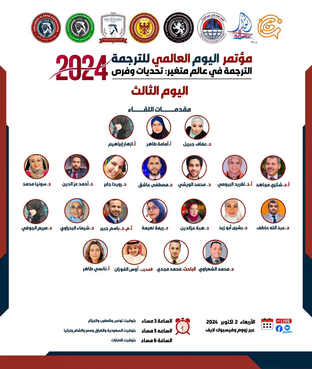 تناولت جلسات المؤتمر مجموعة واسعة من المواضيع المهمة في مجال الترجمة، بما في ذلك: تحديات الترجمة في العصر الرقمي، دور الترجمة في نقل المعرفة، أخلاقيات مهنة الترجمة، مستقبل الترجمة في ظل التطور التكنولوجي، الترجمة الآلية وتحدياتها، ترجمة المصطلحات المتخصصة، الترجمة الأدبية وخصائصها.