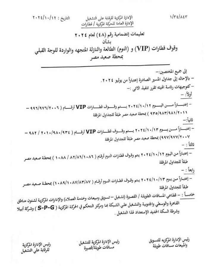 أصدرت الهيئة القومية لسكك حديد مصر، قرارا بتاريخ اليوم 12 أكتوبر الجاري، رقم 48 لعام 2024 بشأن وقوف قطارات (VIP) والنوم الطالعة والنازلة المتجهة والواردة للوجه القبلي بمحطة قطارات صعيد مصر بمنطقة بشتيل بمحافظة الجيزة.