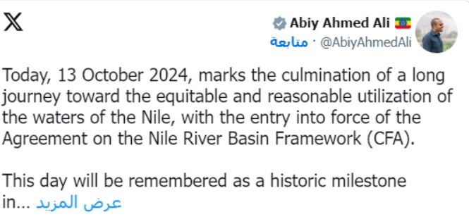 وقال آبي أحمد، عبر حسابه الرسمي في منصة "إكس"، إن "اليوم، 13 أكتوبر 2024، يمثل نهاية رحلة طويلة نحو تحقيق التوزيع العادل والمعقول لمياه النيل".
