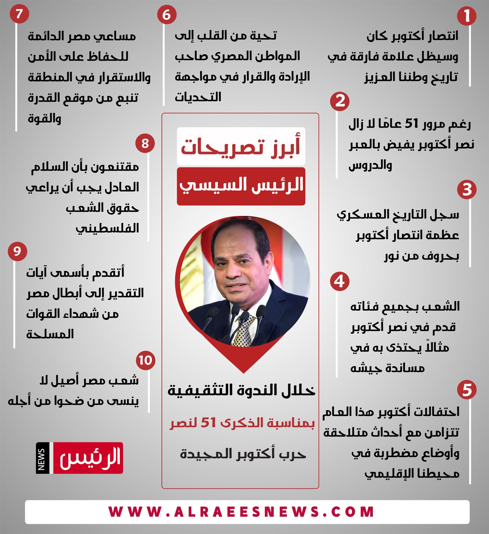 جاء ذلك في كلمة الرئيس السيسي في ختام الندوة التثقيفية الـ 40 للقوات المسلحة في إطار احتفالات مصر بالذكرى الـ51 لنصر أكتوبر المجيد بمركز المنارة للمؤتمرات الدولية بالقاهرة الجديدة.