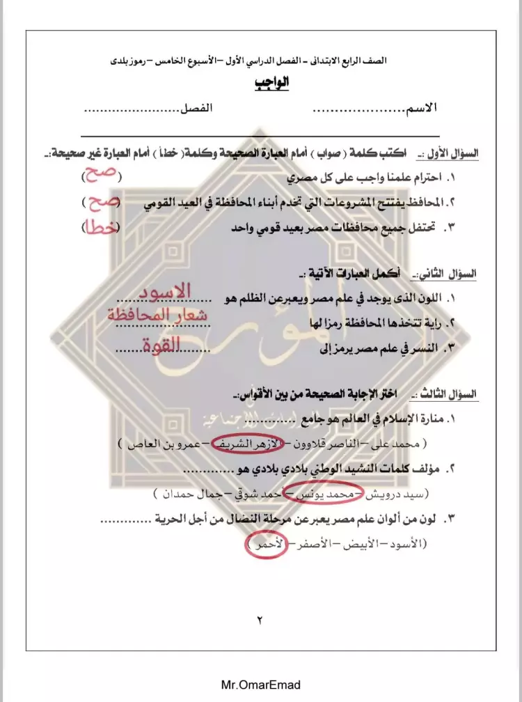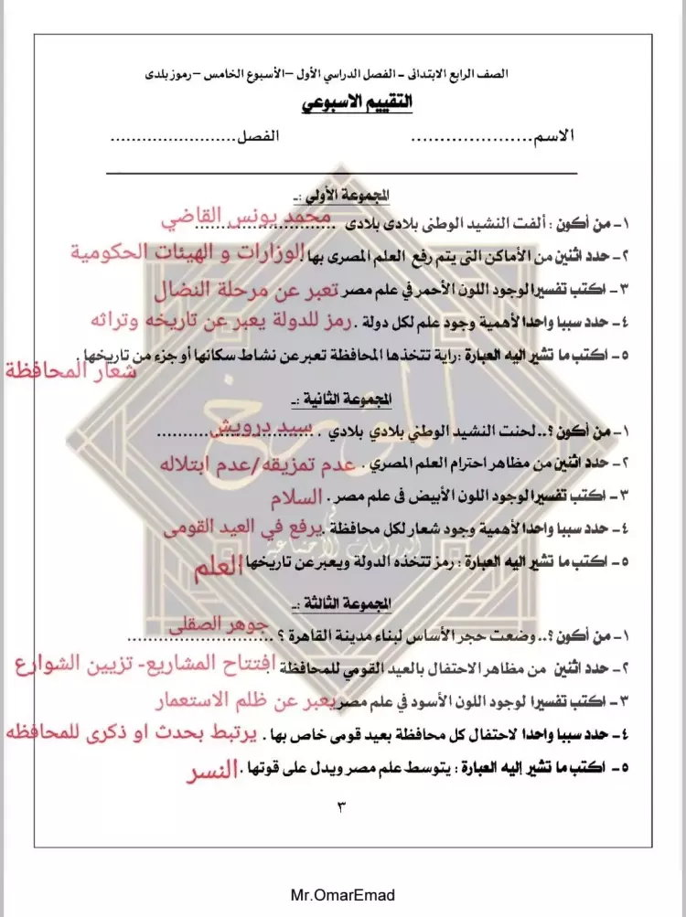 أجاب عدد من المدرسيين على أسئلة الأداء الصفي الأسبوع الخامس في مادة الدراسات الاجتماعية لطلاب الصف الرابع الابتدائي على النحو التالي: