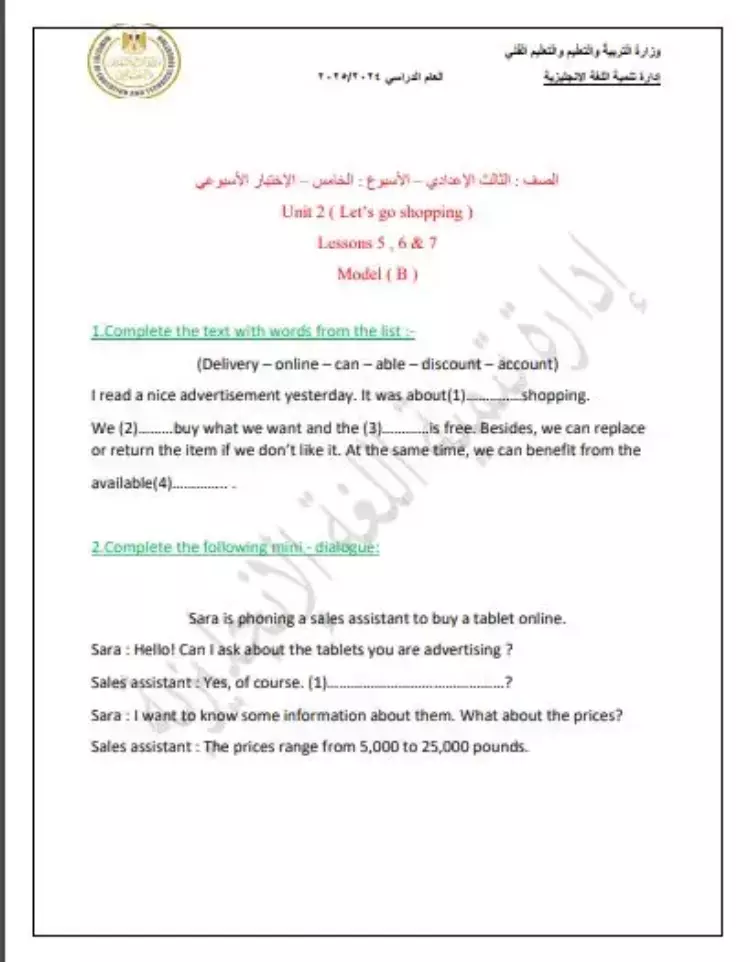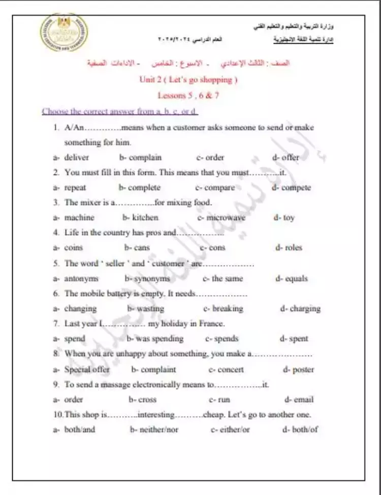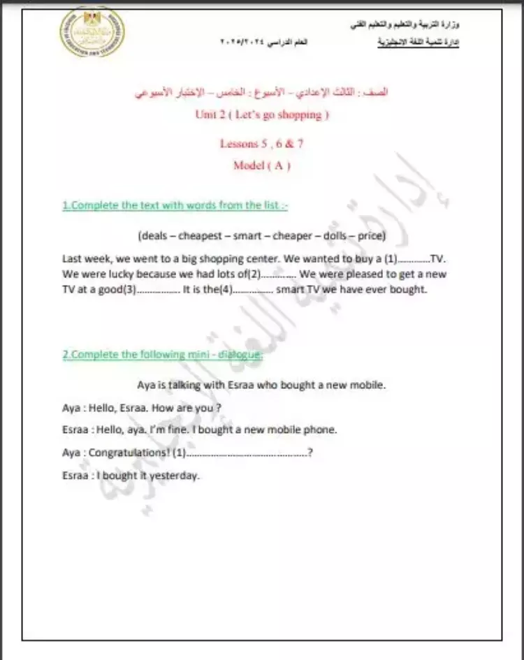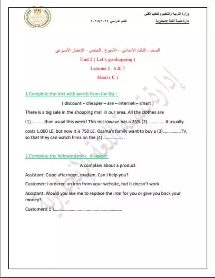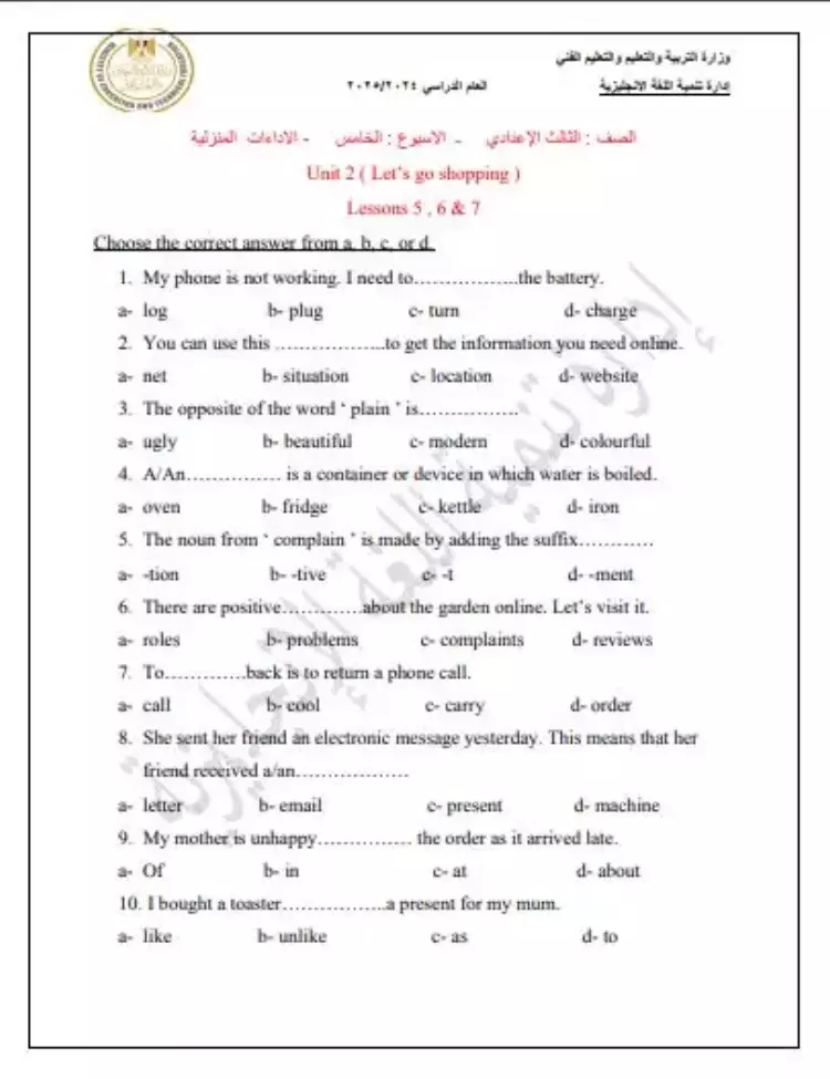 أتاحت إدارة تنمية اللغة الإنجليزية، أسئلة تدريبية تخص الأداء الصفي الأسبوع الخامس لطلاب الصف الثالث الإعدادي في مادة اللغة الإنجليزية وذلك على النحو التالي: