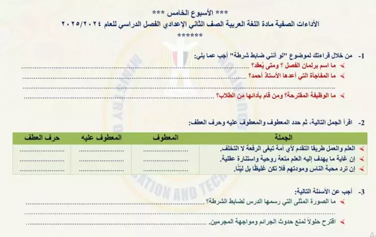 نشرت وزارة التربية والتعليم والتعليم الفني على موقعها الإلكتروني الأداءات الصفية والمنزلية والتقييم الأسبوعي على مقرر الأسبوع الخامس في مادة اللغة العربية للصف الثاني الإعدادي.