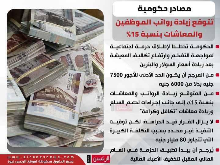 ورجحت مصادر حكومية لـ"الرئيس نيوز"، أن الزيادة ستكون في حدود 15% للمرتبات والمعاشات مع عدد من الإجراءات الخاصة بتوفير السلع وزيادة معاشات تكافل وكرامة.