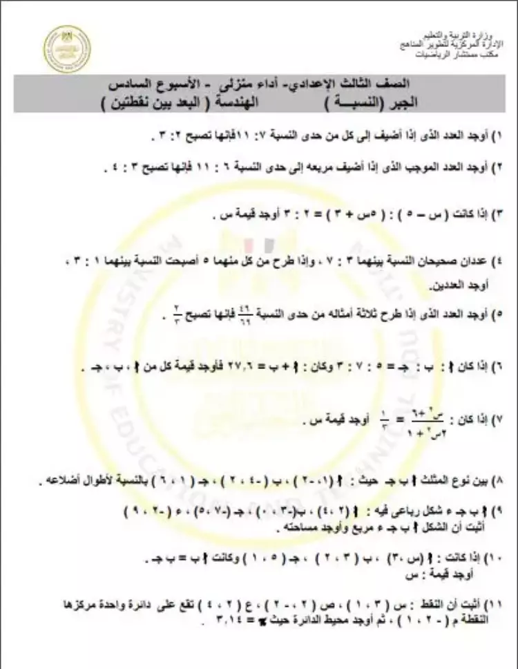 خلال السطور التالية نستعرض أسئلة الواجب المنزلي التي تخص الأسبوع السادس لطلاب وطالبات الصف الثالث الإعدادي على النحو التالي: