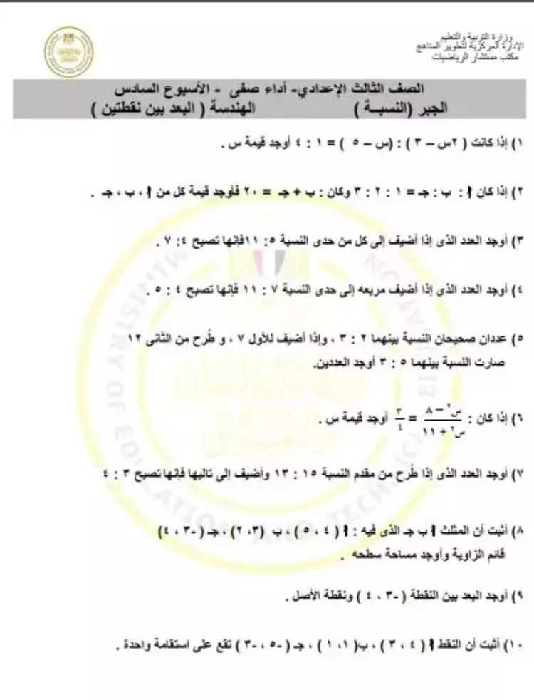 أعد مكتب مستشار الرياضيات التابع لوزارة التربية والتعليم، ملف شامل عن الأسئلة التدريبية التي تخص الواجب المنزلي والأداء الصفي الأسبوع السادس لطلاب الصف الثالث الإعدادي في مادة الرياضيات للعام الدراسي 2024/2025، وفقًا لتوجيهات وزير التربية والتعليم.