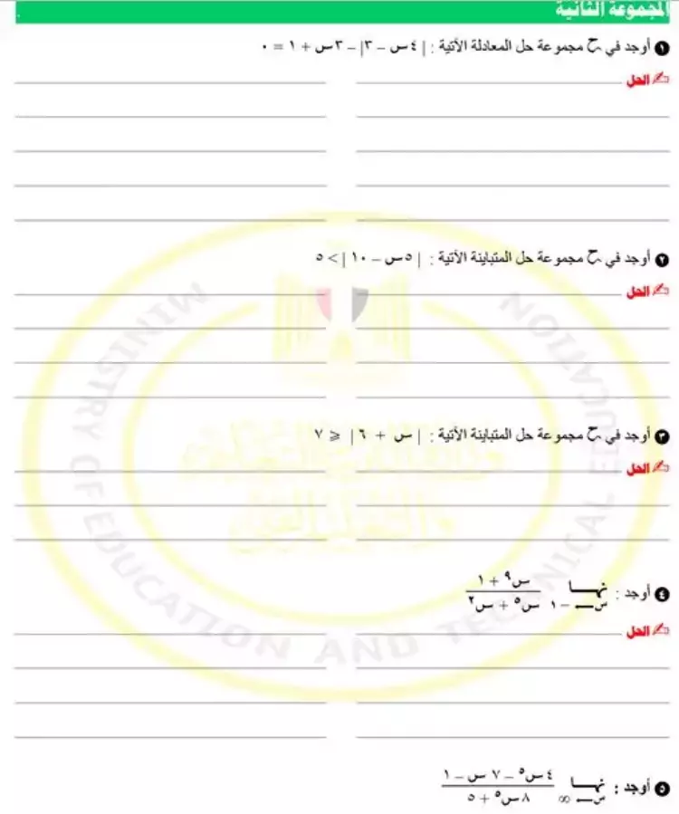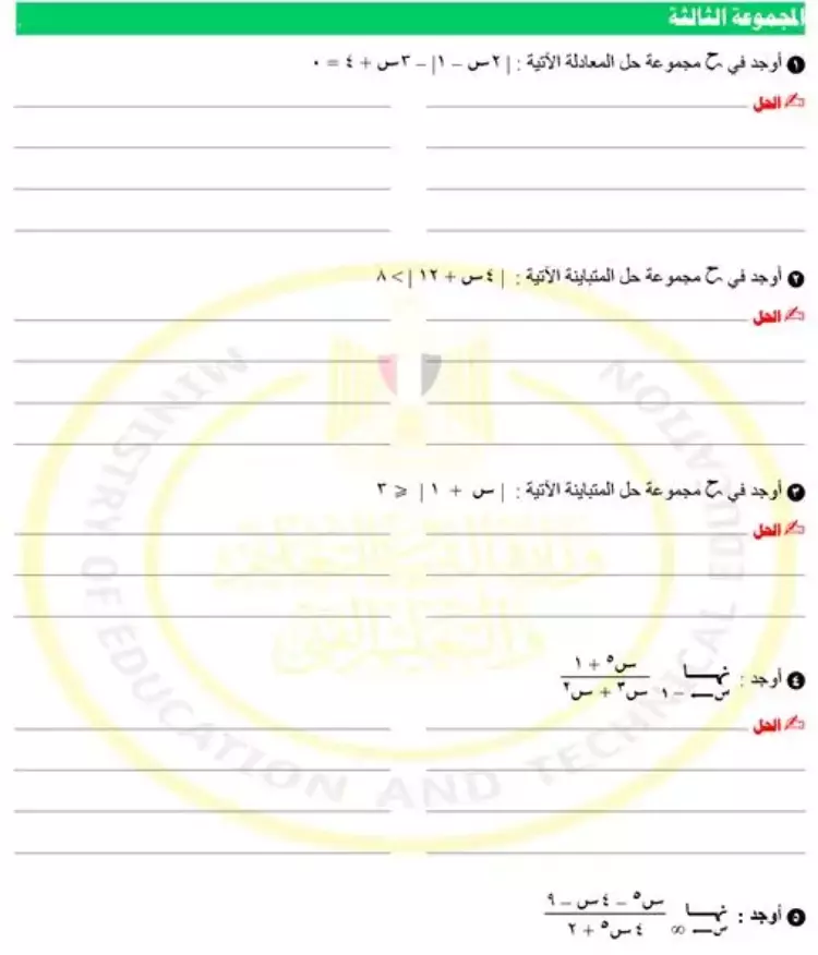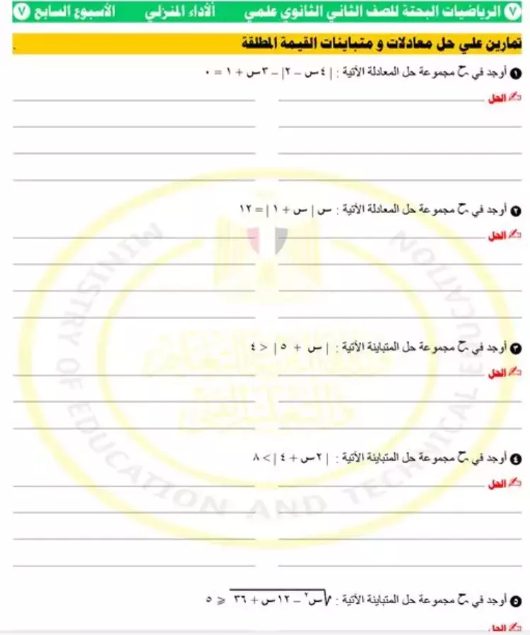 9- أوجد في ح مجموعة حل المعادلة الآتية: | 5س – 2 | - 2س – 1 = 0
