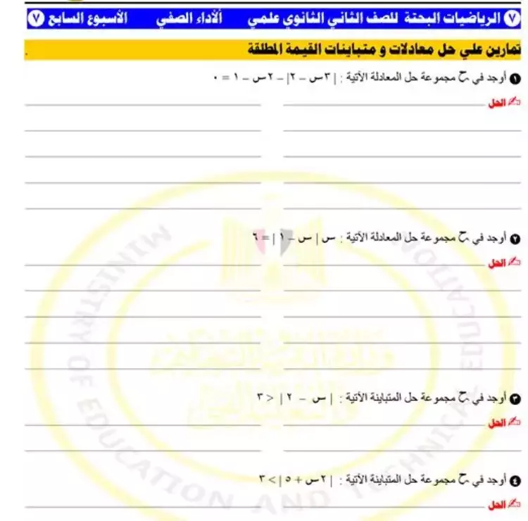 نشرت وزارة التربية والتعليم والتعليم الفني تقييمات الأسبوع السابع من الفصل الدراسي الأول للعام 2024-2025 في مادة الرياضيات البحتة للصف الثاني الثانوي بالشعبة العلمية.
