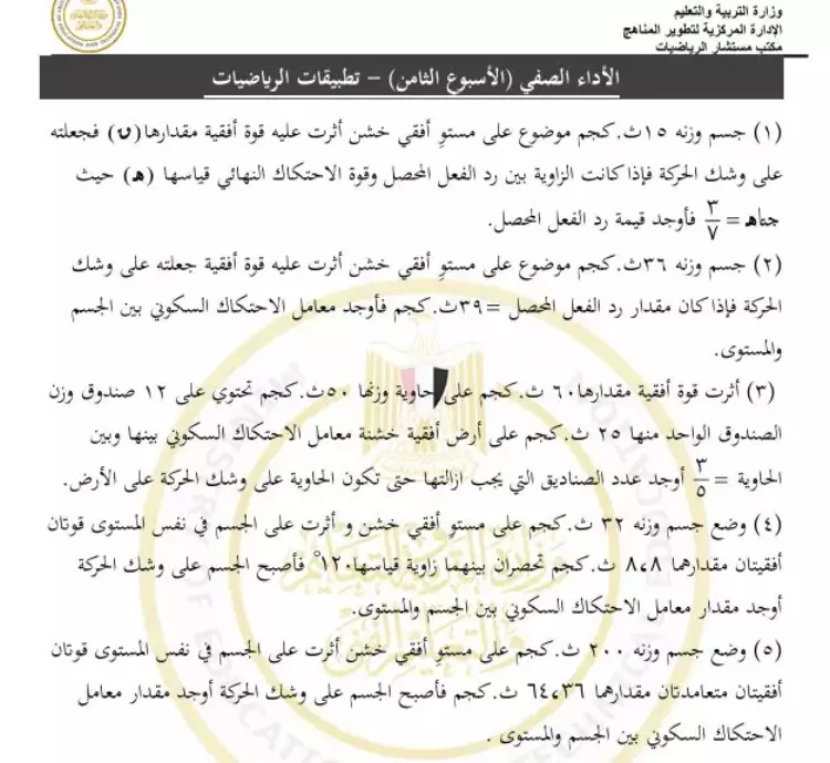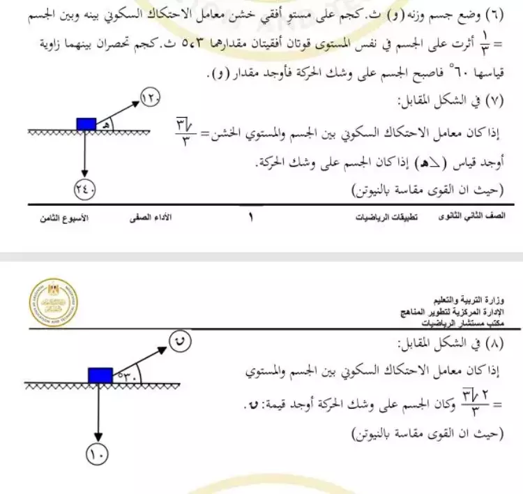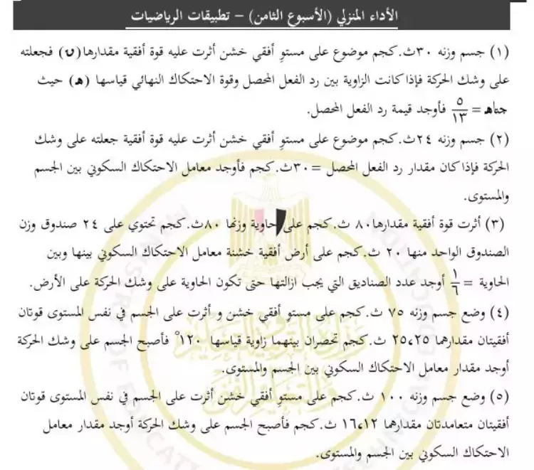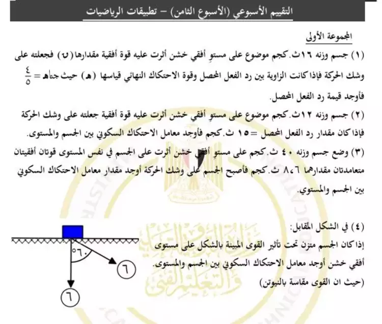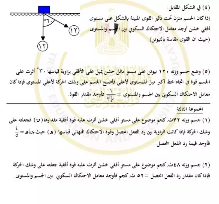 1- جسم وزنه 15 ث. كجم موضوع على مستوى أفقي خشن أثرت عليه قوة أفقية مقدارها (ن) فجعلته على وشك الحركة، فإذا كانت الزاوية بين رد الفعل المحصل وقوة الاحتكاك النهائي قياسها (هـ) حيث جتا هـ = 3 / 7 فأوجد قيمة رد الفعل المحصل.