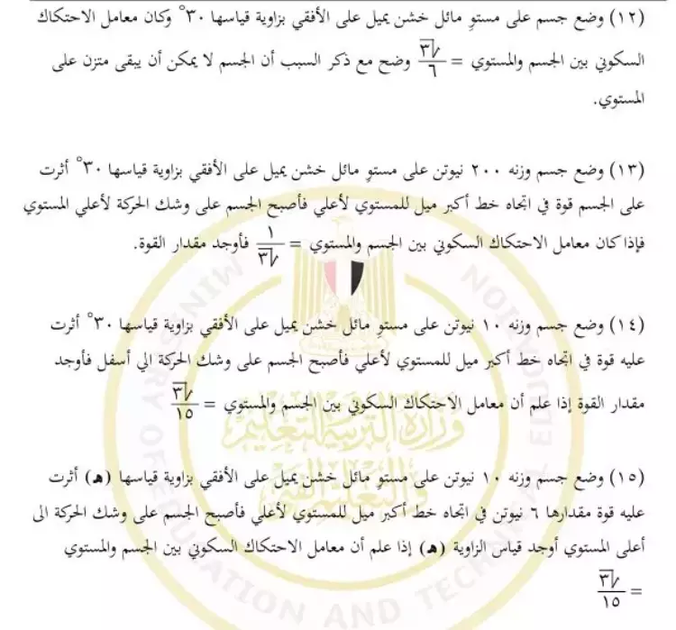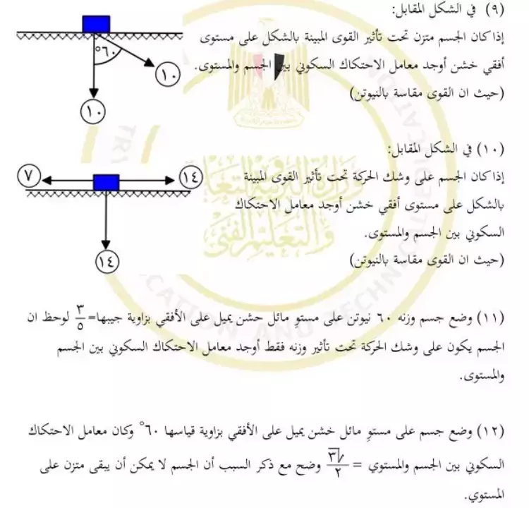 4- وضع جسم وزنه 90 نيوتن على مستو مائل خشن يميل على الأفقي بزاوية جيبها 5 / 13 لوحظ أن الجسم يكون على وشك الحركة تحت تأثير وزنه فقط أوجد معامل الاحتكاك السكني بين الجسم والمستوى.