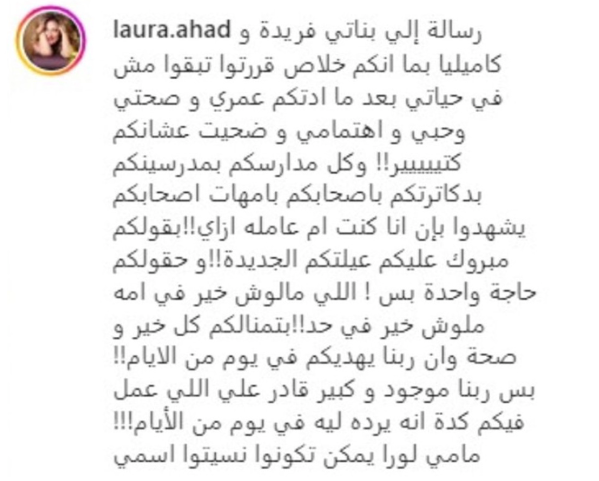 الجدير بالذكر أن حدث خلاف كبير بين لورا عماد وابنتيها من زوجها شريف منير في شهر أغسطس 2022 عبر مواقع السوشيال ميديا، وقامت والدتهم بكتابة رسالة لهم عبر صفحتها الشخصية بموقع «انستجرام» قائلة: «رسالة إلى بناتي فريدة وكاميليا.. بما إنكم خلاص قررتوا تبقوا مش في حياتي بعد ما اديتكم عمري وصحتي وحبي واهتمامي وضحيت عشانكم كتير!! وكل مدارسكم بمدرسينكم بدكاترتكم بأصحابكم بأمهات أصحابكم يشهدون بأن أنا كنت أم عاملة إزاي».