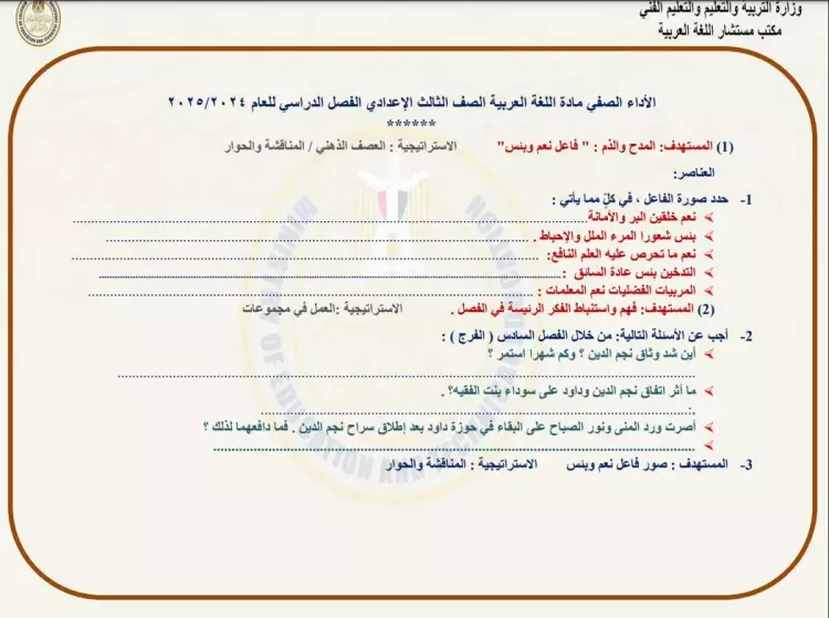 جاءت أسئلة الأداء الصفي عربي للصف الثالث الإعدادي الأسبوع العاشر على النحو التالي: