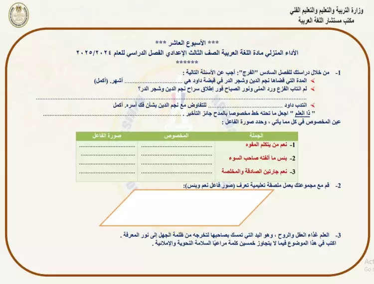 تضمنت أسئلة الواجب المنزلي للصف الثالث الإعدادي عربي الأسبوع العاشر ما يلي: