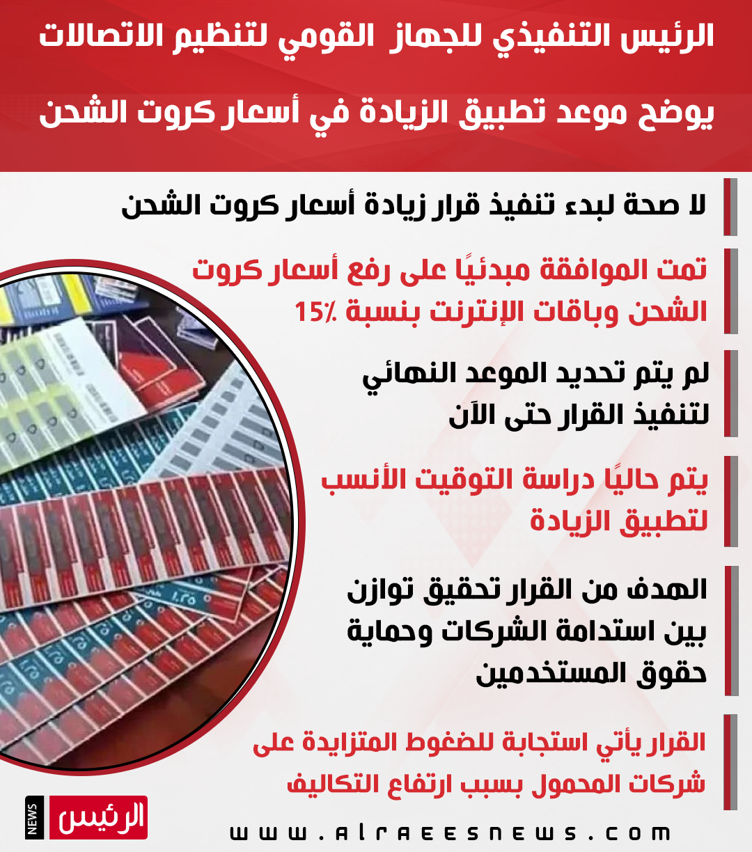 نفى محمد شمروخ، الرئيس التنفيذي للجهاز القومي لتنظيم الاتصالات، بدء تطبيق قرار زيادة أسعار كروت الشحن، قائلا إن الجهاز قد وافق بشكل مبدئي على رفع أسعار كروت الشحن وباقات الإنترنت بنسبة 15%، لكنه لم يحدد بعد الموعد النهائي لتنفيذ القرار.