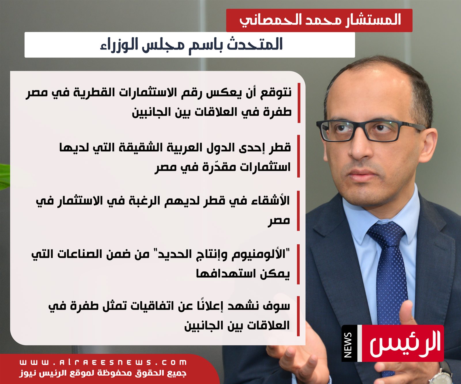 أكد المستشار محمد الحمصاني المتحدث باسم مجلس الوزراء أن المباحثات بين الدكتور مصطفى مدبولي رئيس الحكومة ونظيره القطري تطرقت للاستثمارات القطرية في مجال الصناعة.