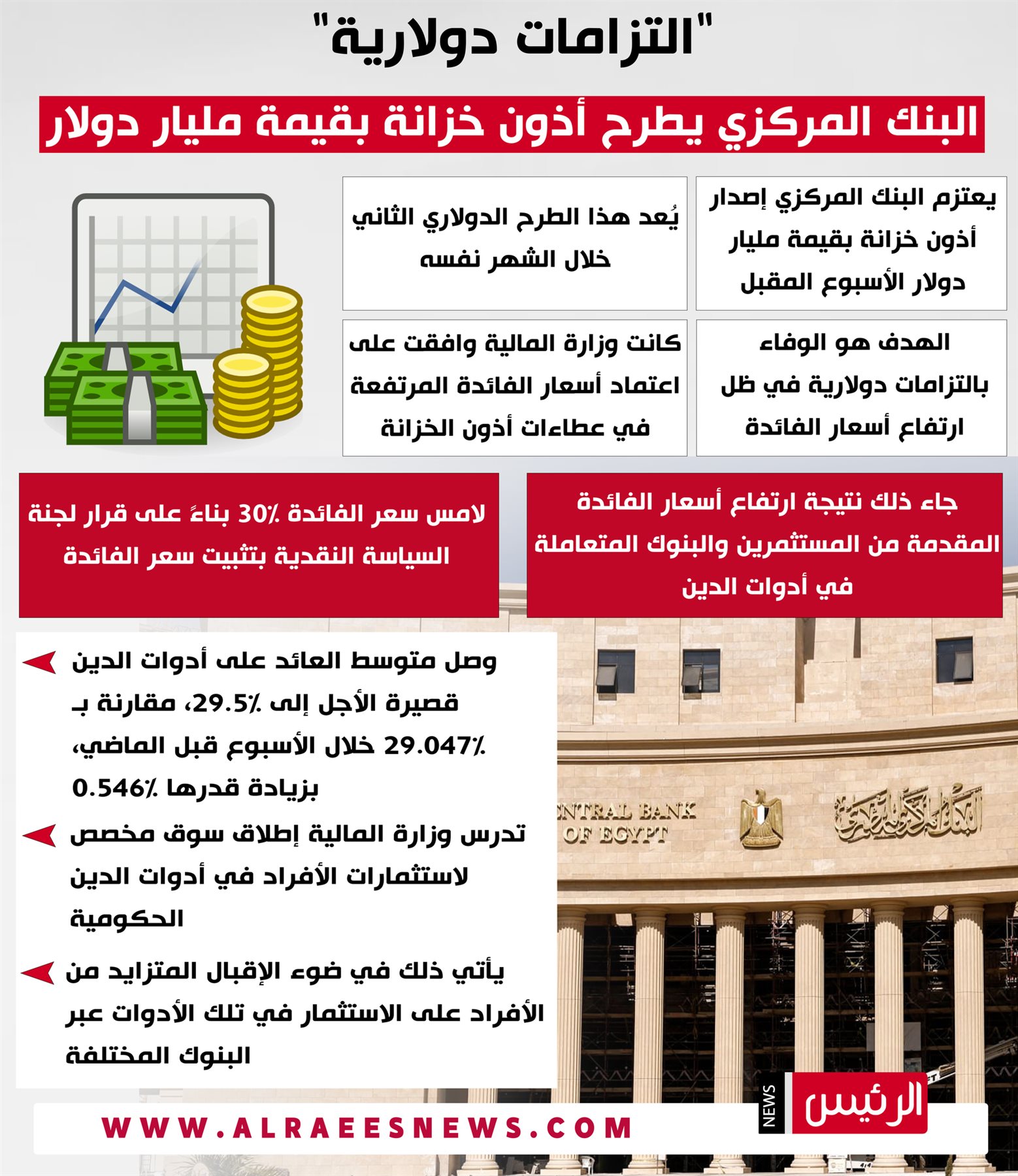 يعتزم البنك المركزي إصدار أذون خزانة بقيمة مليار دولار الأسبوع المقبل؛ ليكون هذا الطرح الدولاري الثاني في الشهر نفسه، للوفاء بالتزامات دولارية في ظل ارتفاع سعر الفائدة.