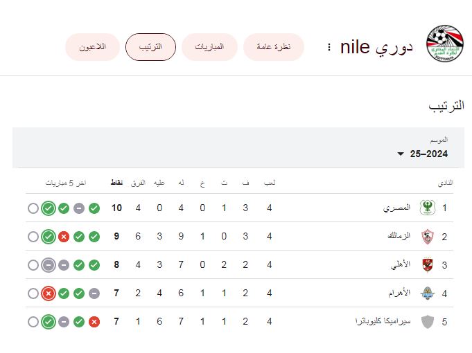 يبحث الكثير من الجماهير عن ترتيب الدوري المصري بعد فوز الزمالك والمصري، وذلك ضمن منافسات الجولة الرابعة من عمر المسابقة المحلية للموسم 2025-2024.