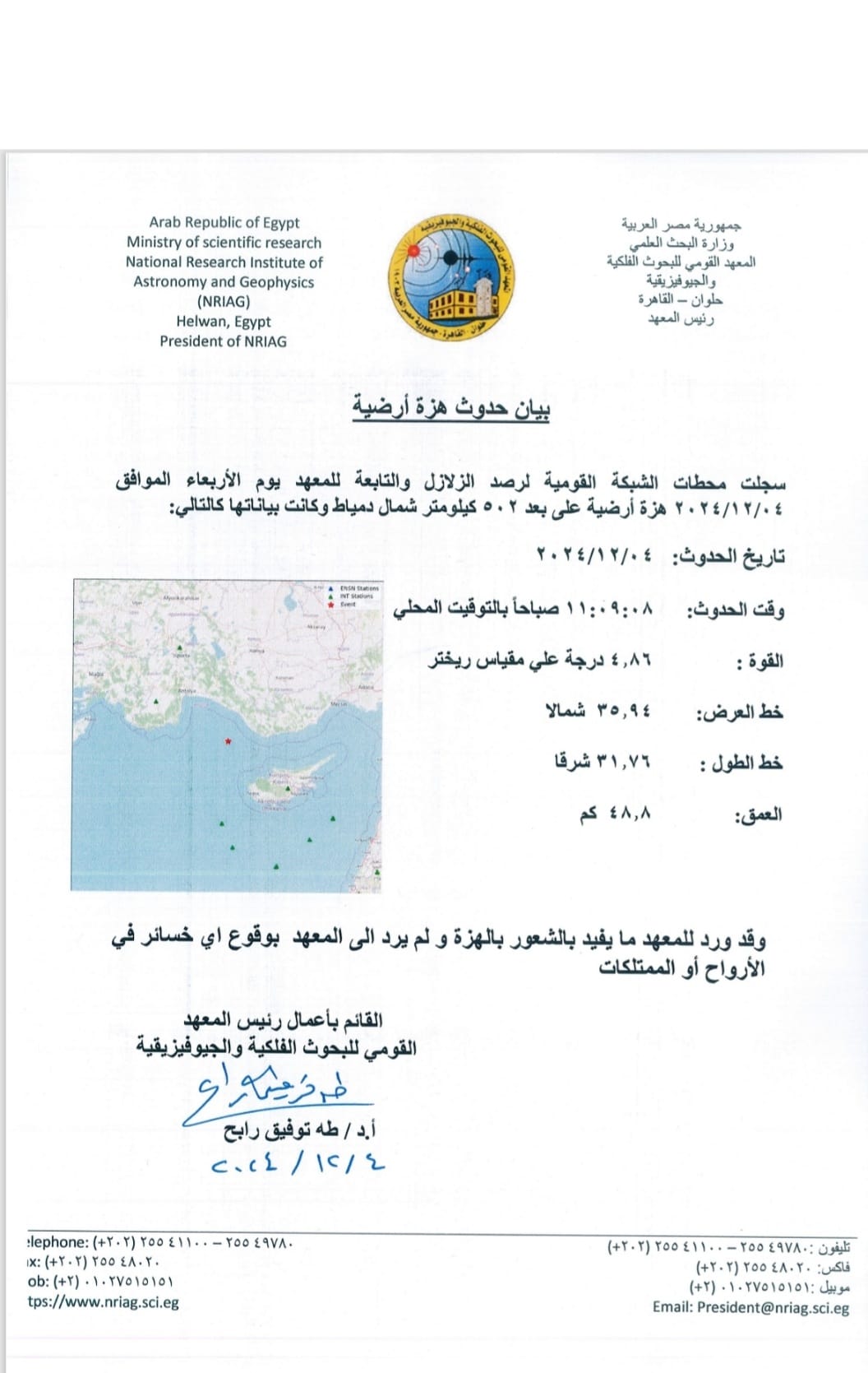 كشف الدكتور طه رابح، رئيس المعهد القومي للبحوث الفلكية، أن محطات الشبكة القومية لرصد الزلازل، والتابعة للمعهد، سجلت هزة أرضية بقوة 4.8 درجة على مقياس ريختر شمال غرب قبرص، على بعد 502 كم من دمياط.