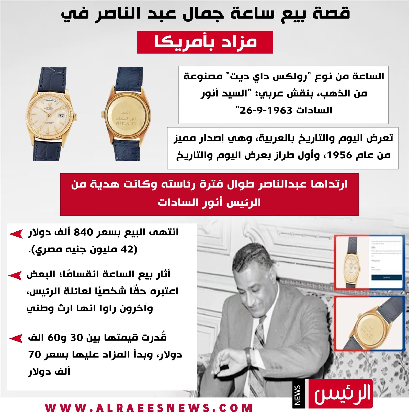 وفي سياق الإنفوجراف التالي نستعرض قصة بيع ساعة جمال عبد الناصر في مزاد بأمريكا