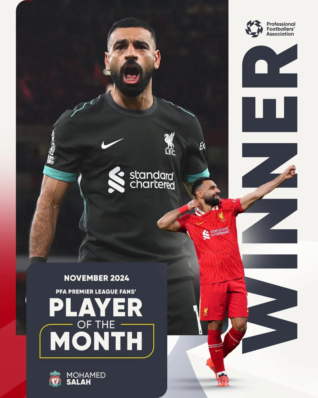 توج النجم المصري محمد صلاح لاعب ليفربول، بجائزة أفضل لاعب في الدوري الإنجليزي الممتاز لشهر نوفمبر المقدمة من رابطة اللاعبين المحترفين PFA بتصويت الجماهير.