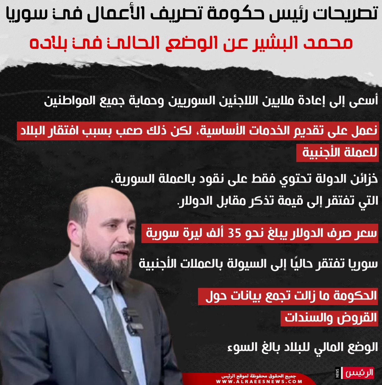 وأضاف البشير أن سوريا ليس لديها حالًا سيولة بالعملات الأجنبية، مشيرًا إلى أن الحكومة مازالت تجمع بيانات عن القروض والسندات، وقال إن وضع البلاد المالي بالغ السوء.