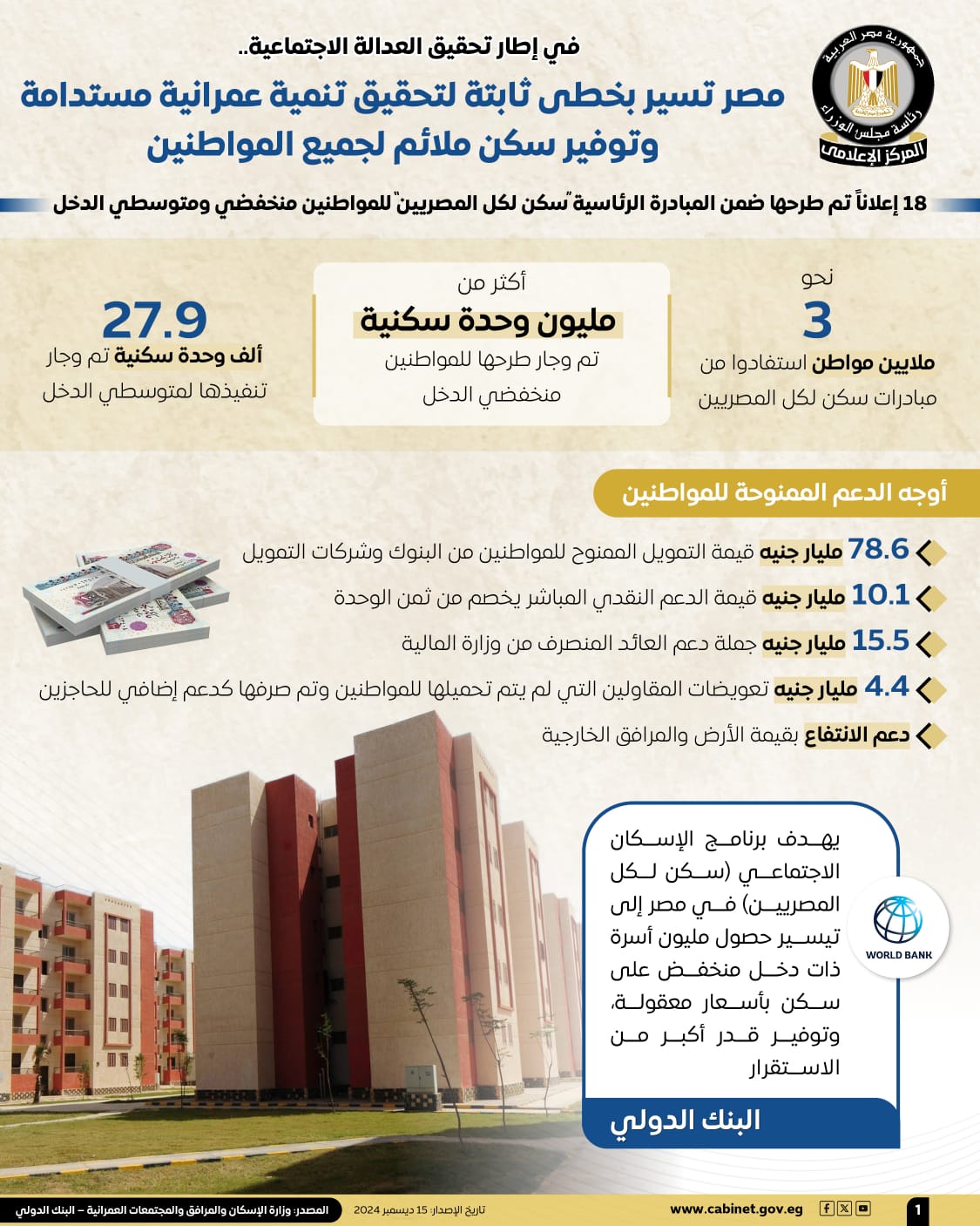 هذا وقد أكد البنك الدولي، أن برنامج الإسكان الاجتماعي "سكن لكل المصريين" في مصر يهدف إلى تيسير حصول مليون أسرة ذات دخل منخفض على سكن بأسعار معقولة، وتوفير قدر أكبر من الاستقرار.