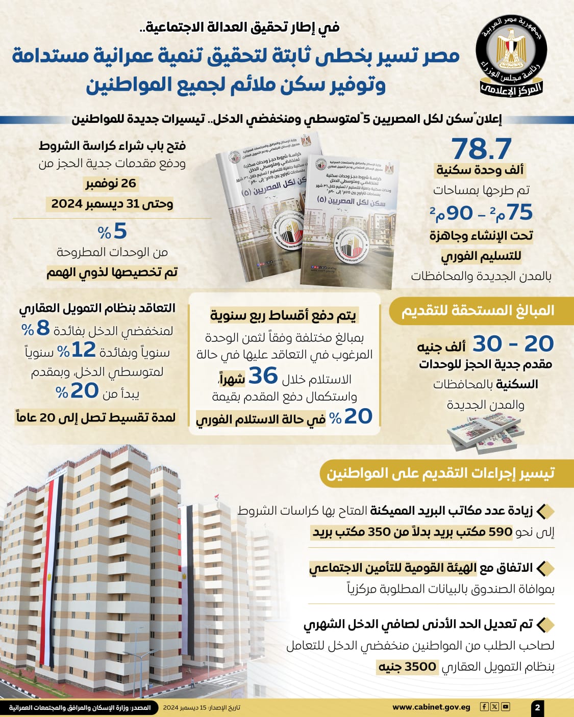 يأتي هذا بينما، تطرق التقرير إلى إعلان سكن لكل المصريين 5 لمتوسطي ومنخفضي الدخل بتيسيرات جديدة للمواطنين، والذي يتضمن طرح 78.7 ألف وحدة سكنية بمساحات تتراوح من 75 م2 إلى 90 م2، مقسمة إلى وحدات تحت الإنشاء وأخرى جاهزة للتسليم الفوري بالمدن الجديدة والمحافظات، وقد تم فتح باب شراء كراسة الشروط ودفع مقدمات جدية الحجز من 26 نوفمبر 2024 حتى 31 ديسمبر 2024، علمًا بأنه تم تخصيص 5% من الوحدات المطروحة لذوي الهمم.