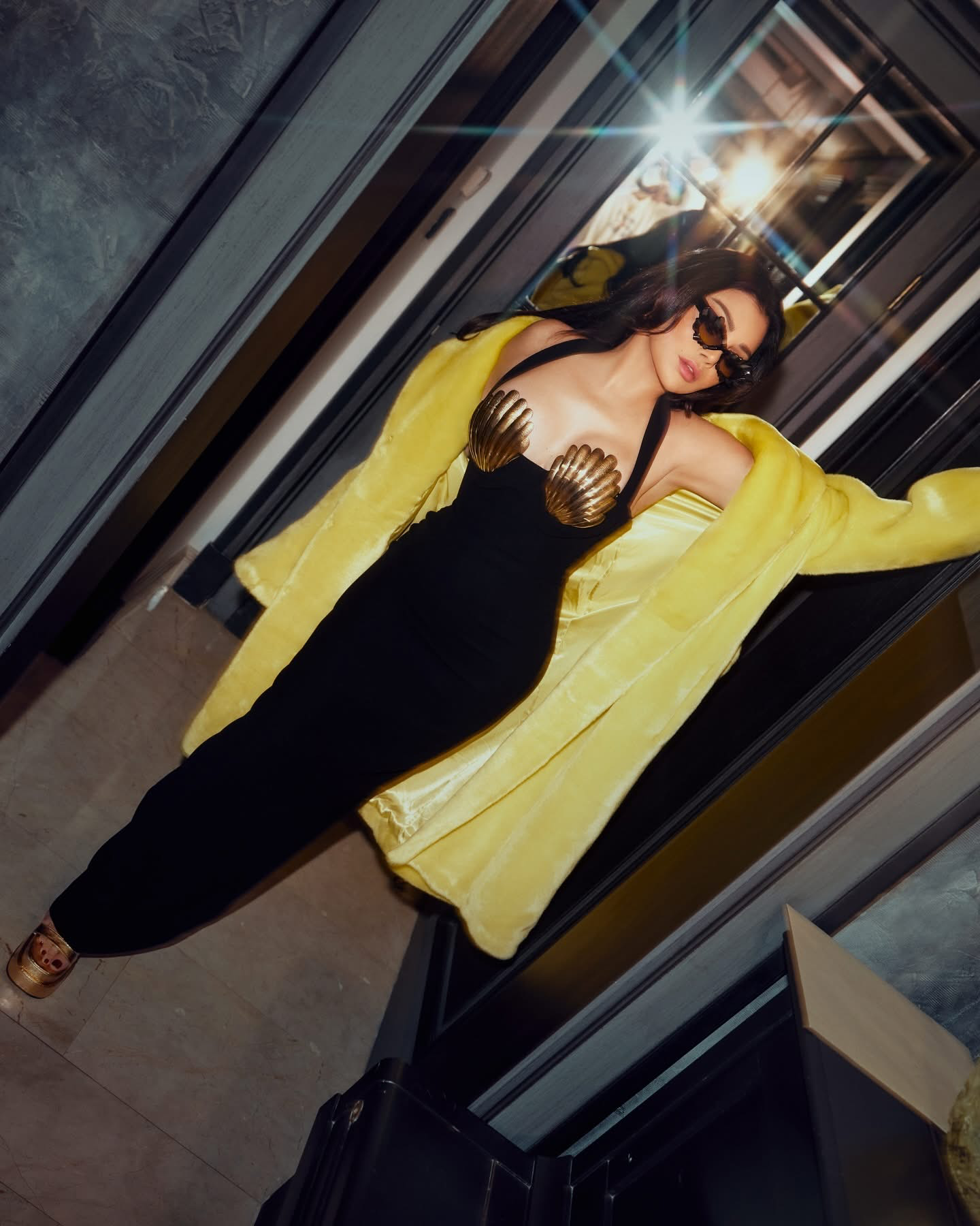 نشرت هيفاء وهبى مجموعة صور، عبر حسابها الرسمي بموقع "انستجرام"، ظهرت فيها مرتدية فستان "جريء"، لتنهال عليها تعليقات المعجبين والمتابعين. وتألقت هيفاء وهبي فى الصور بإطلالة ملفتة مرتدية فستانا باللون الأسود ونسقت معه روب باللون الأصفر. كما اختارت، أن تترك بشرتها على طبيعتها ووضعت بعض مساحيق المكياج بالألوان الهادئة، وقامت بترك شعرها الطويل منسدلا بين كتفيها بطريقة الكيرلي الجذابة التي تتناسب مع ظهورها.