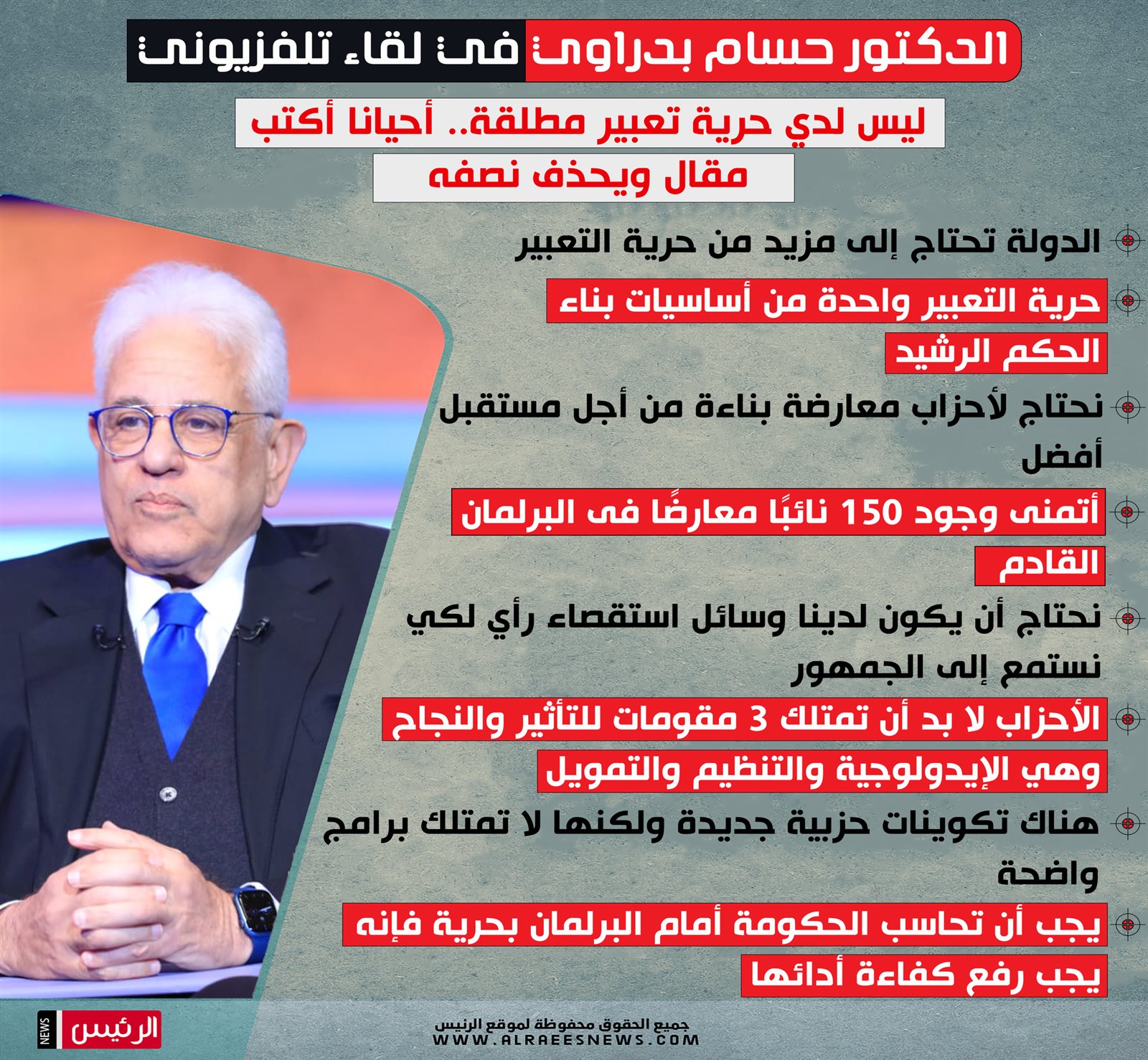 وفي سياق السطور التالية نستعرض أبرز تصريحات المفكر السياسي الدكتور حسام بدراوي في لقاء تلفزيوني