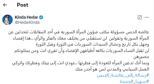 كيندا حيدر، إعلامية سورية، قالت في منشور عبر صفحتها على “إكس”: “تتحدثين عن المرأة السورية وتقولين لن تستقبلي من يختلف معك بالفكر والرأي..هذا إقصاء وجهل بكل تاريخ ونضال السيدات السوريات في الثورة وقبل الثورة”.