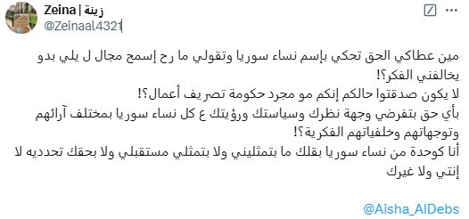 وفي السياق، قالت زينة سيدة سورية على موقع "إكس": "مين عطاكي الحق تحكي باسم نساء سوريا وتقولي ما رح أسمح مجال ل يلي بدو يخالفني الفكر؟! لا يكون صدقتوا حالكم إنكم مو مجرد حكومة تصريف أعمال؟!".