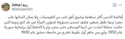 واستكملت: “عائشة الدبس أكثر سطحية وضيق أفق حتى من القبيسيات، ولا يمكن ائتمانها على مجرد تربية طفل صغير، فكيف تسمى مسؤولة لشؤون المرأة في بلد أنتج زنوبيا التي حكمت مملكة امتدت من آسيا الوسطى حتى مصر، وثريا الحافظ أول برلمانية سورية عام 1953، ولوريس ماهر أول طبيبة تتخرج من جامعة دمشق عام 1930”.
