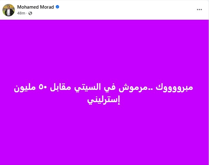 وكتب مراد عبر حسابه الشخصي على موقع التواصل الاجتماعي "فيسبوك": "مبروك مرموش في السيتي مقابل 50 مليون جنيه إسترليني".