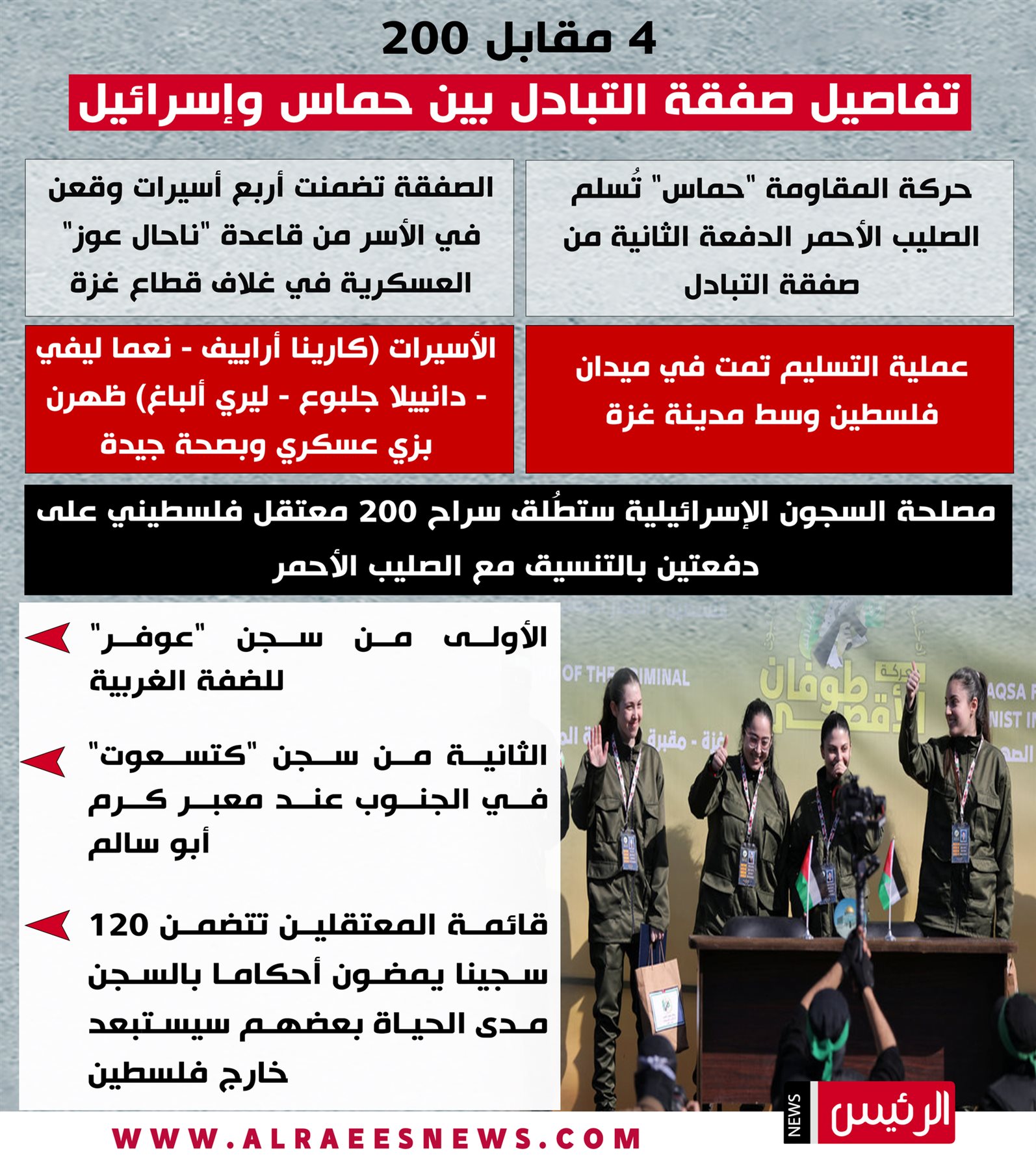 وخلال وقت سابق، سلمت حركة حماس، أربع أسيرات إلى الصليب الأحمر تمهيدًا لتسليمهن إلى دولة الاحتلال، ضمن صفقة تبادل الأسرى، ووقف العدوان على غزة.